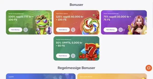 | Velkomsttilbud (3 innskudd) | Matcher + gratisspinn | 100% opptil 7 770 NOK + 100 FS; 50% opptil 10 000 NOK + 50 FS; 75% opptil 10 000 NOK + 75 FS; min. 200 NOK; omsetning 40x bonus |