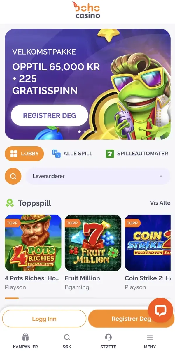 | Spillutvalg | 8 500 spill fra leverandører inkludert Evolution, Quickspin, Blueprint, Merkur og Pragmatic Play, pluss Boho mobilapp-tilgang i nettleseren din |